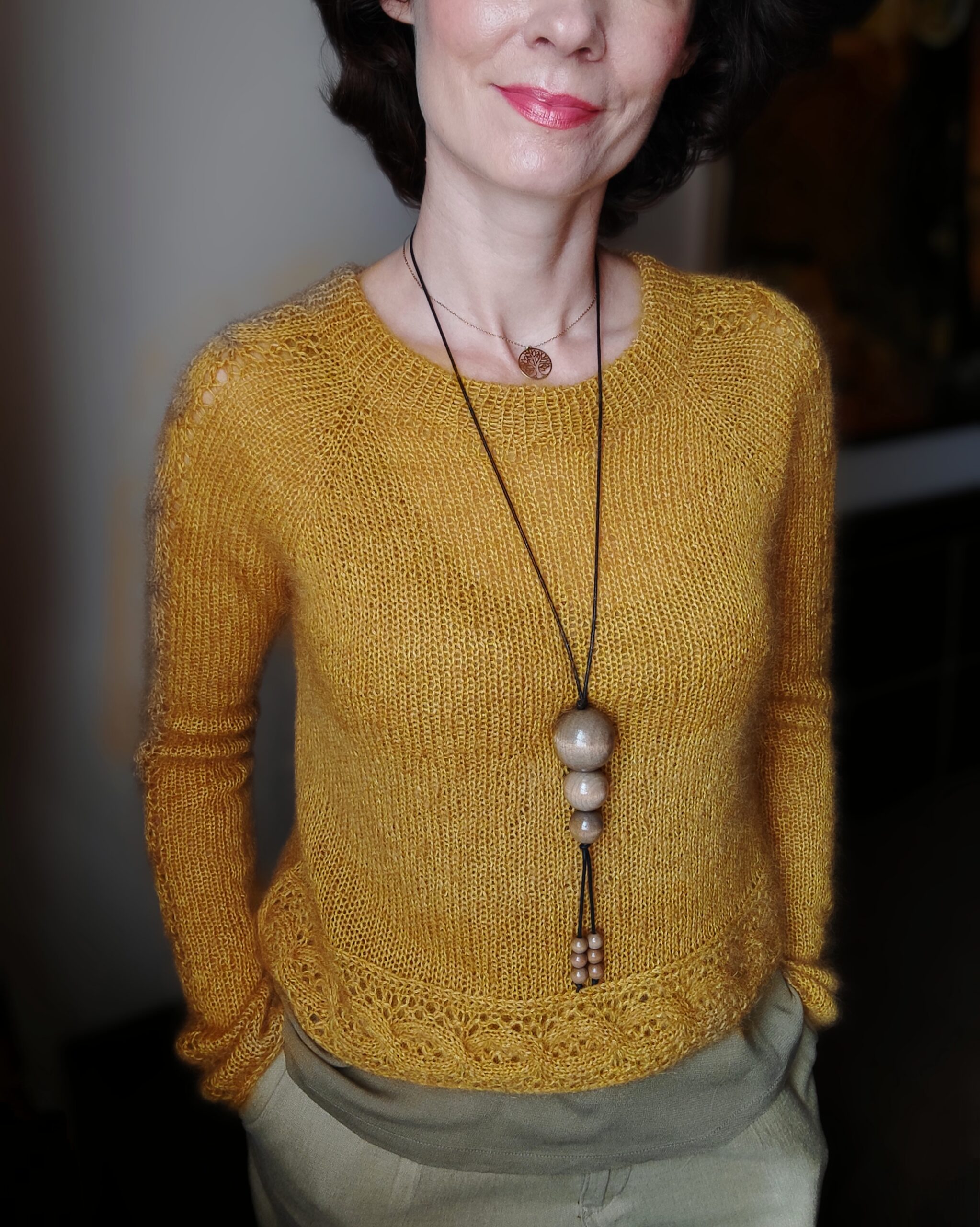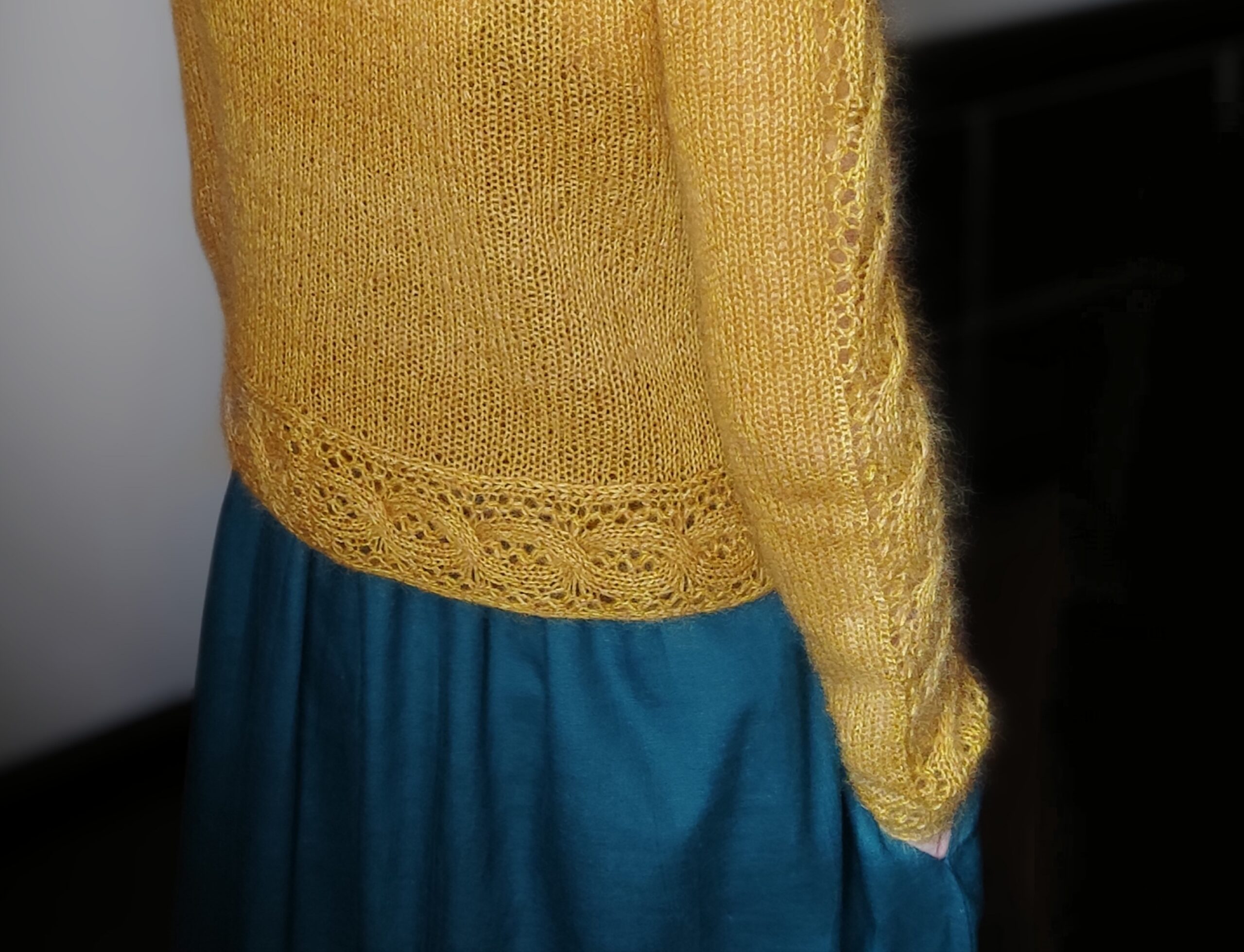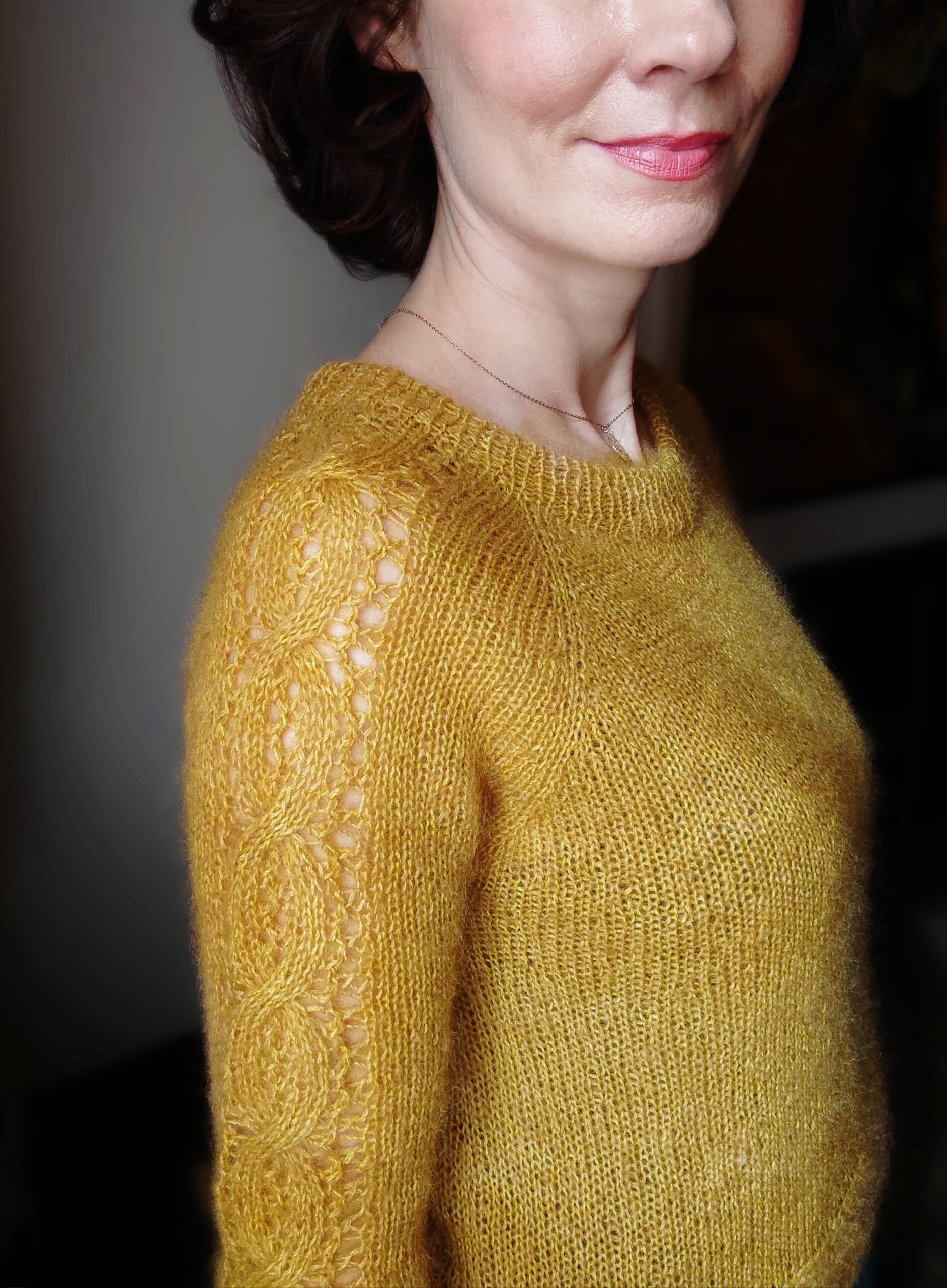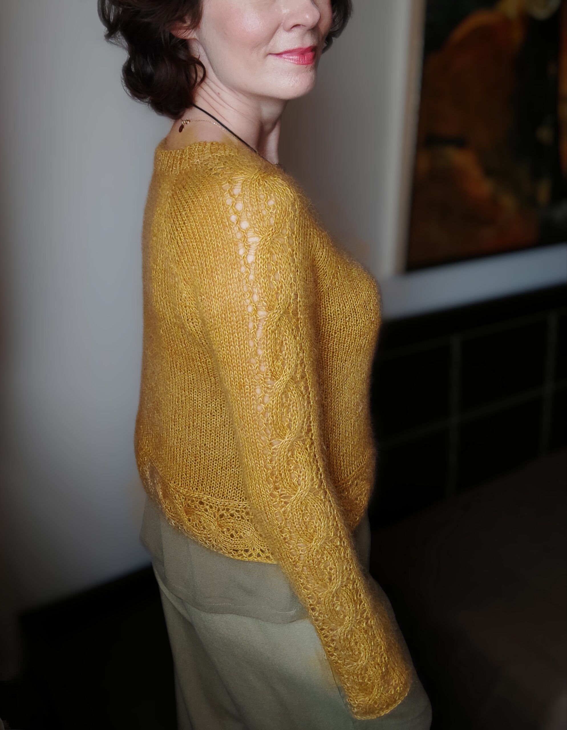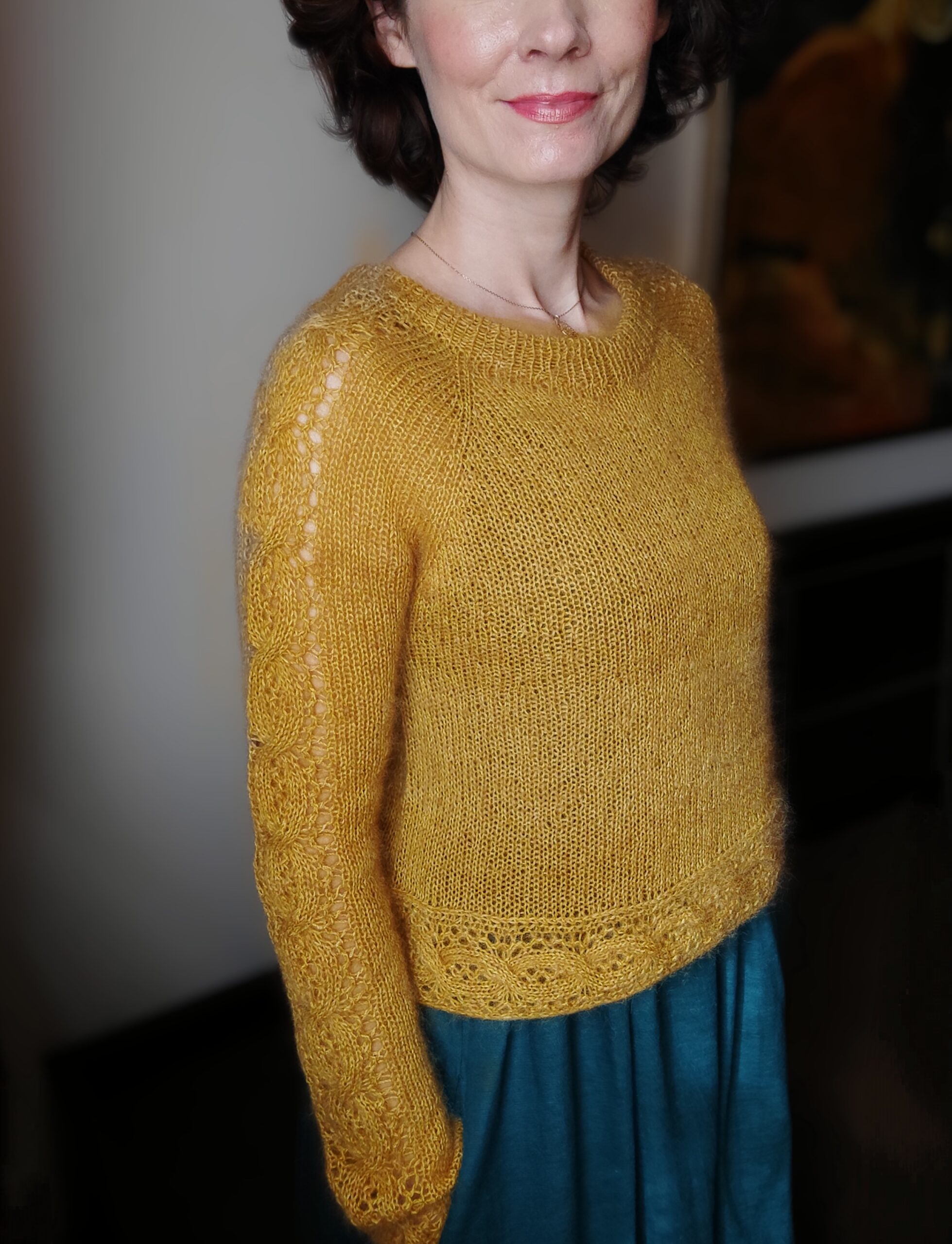 Sweter jest robiony na okrągło, od góry, bez zszywania, w jednym kawałku. Raglanowy karczek i rękawy są dopasowane. Sweter jest rozszerzany w kształcie litery A. Główne druty: 4,5 mm (US 7). Dekolt swetra jest formowany rzędami skróconymi. Podwójna plisa dekoltu jest łączona ze swetrem bez zszywania. Wykończenie swetra jest ozdobione ażurową plisą z warkoczami. Ażur i warkocze zdobią także rękawy.