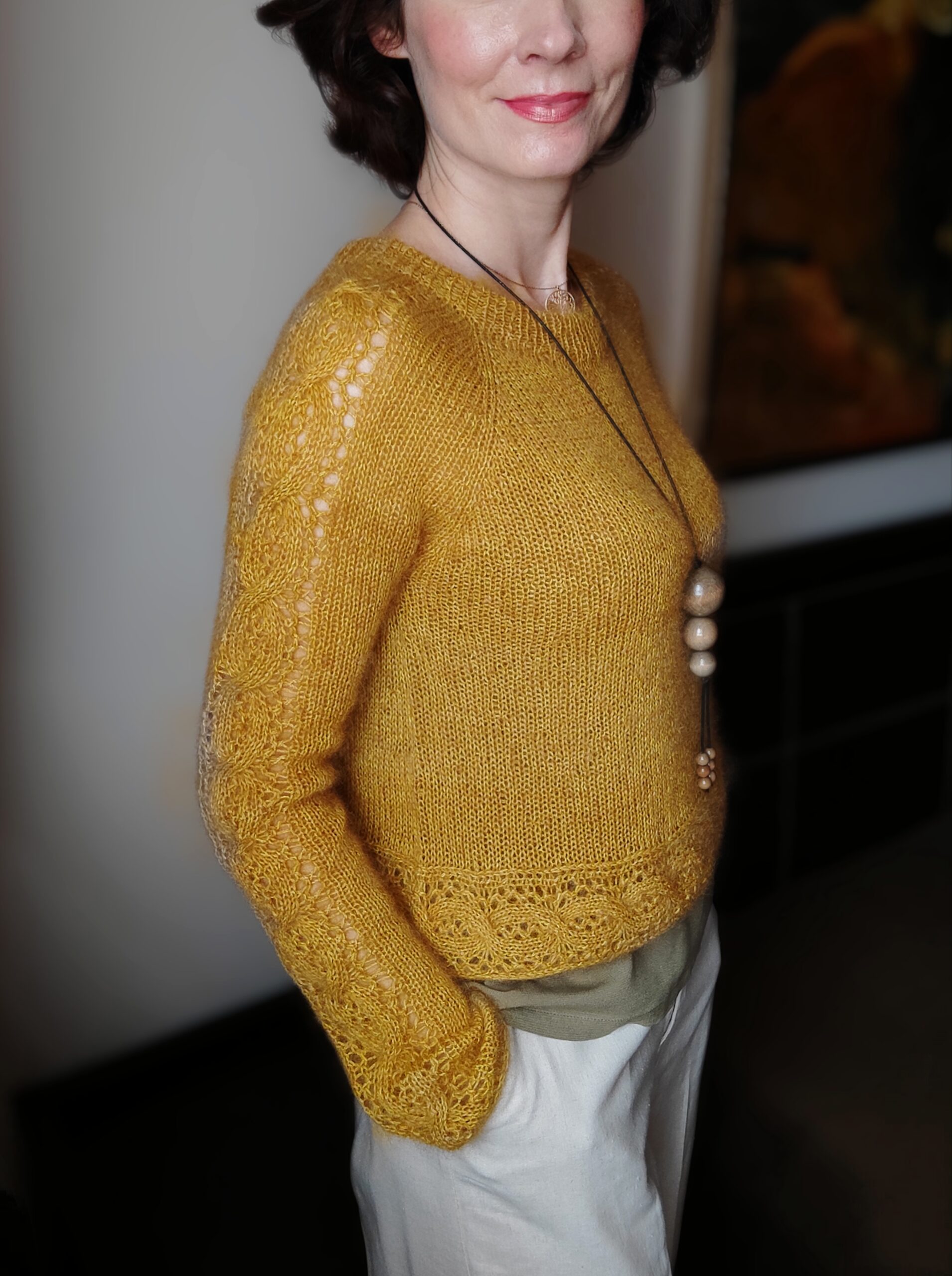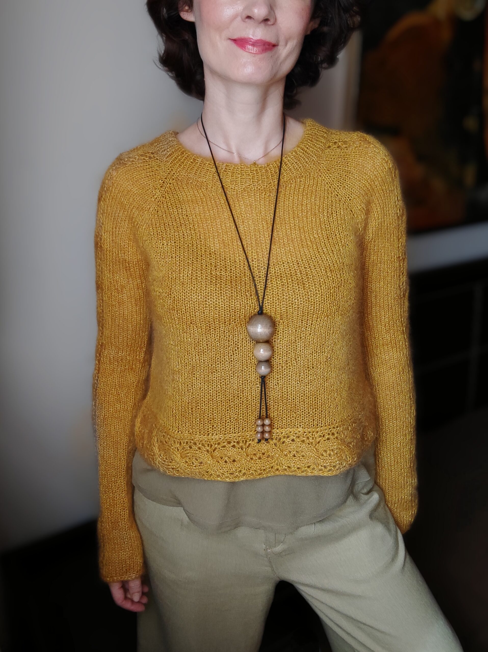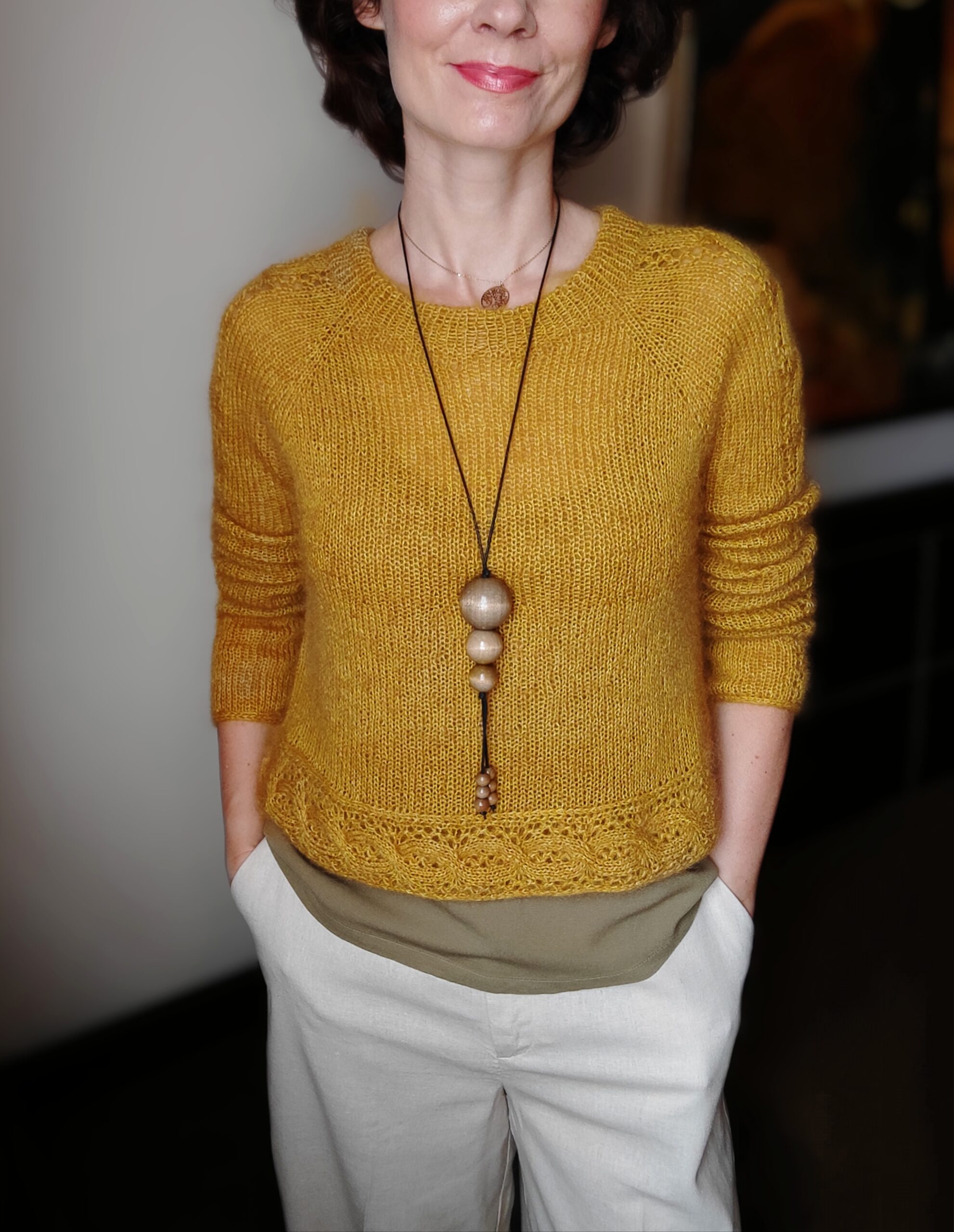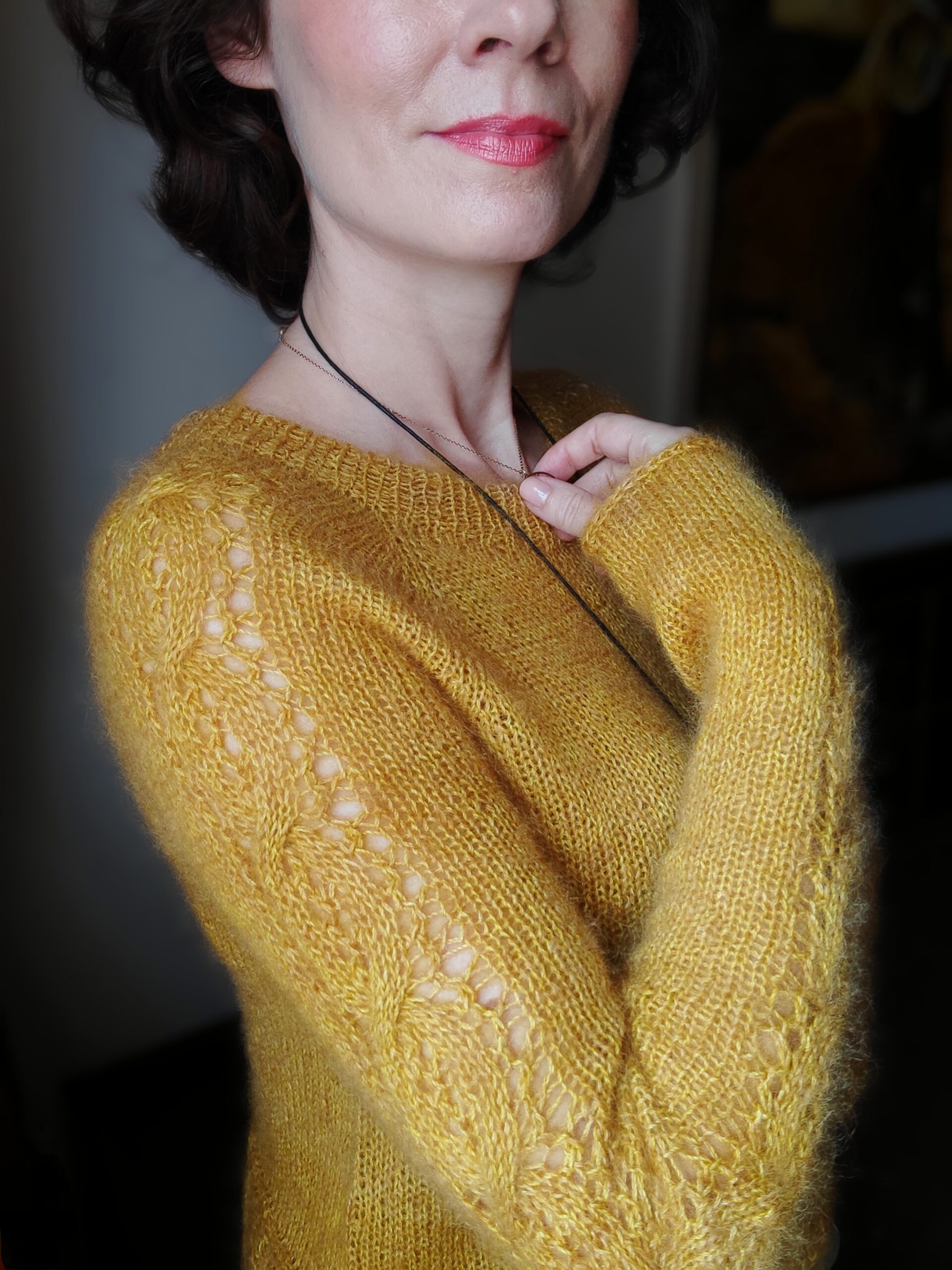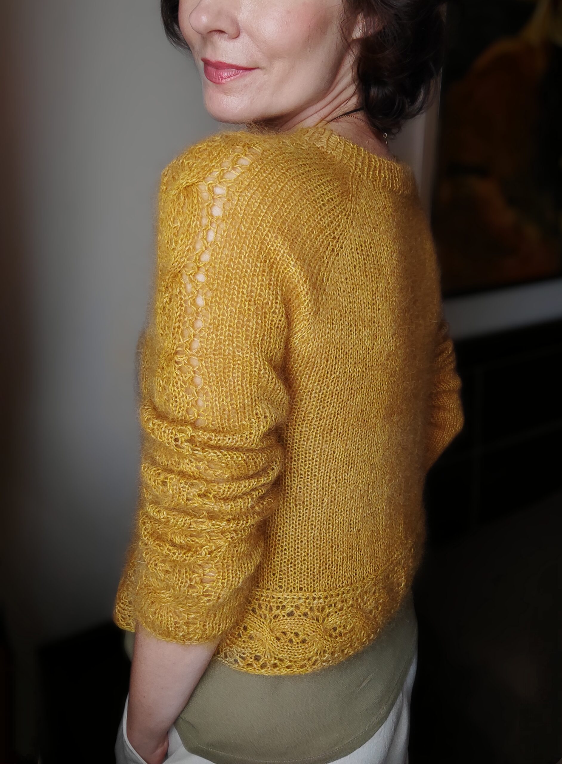 Sweter jest robiony na okrągło, od góry, bez zszywania, w jednym kawałku. Raglanowy karczek i rękawy są dopasowane. Sweter jest rozszerzany w kształcie litery A. Główne druty: 4,5 mm (US 7). Dekolt swetra jest formowany rzędami skróconymi. Podwójna plisa dekoltu jest łączona ze swetrem bez zszywania. Wykończenie swetra jest ozdobione ażurową plisą z warkoczami. Ażur i warkocze zdobią także rękawy.
